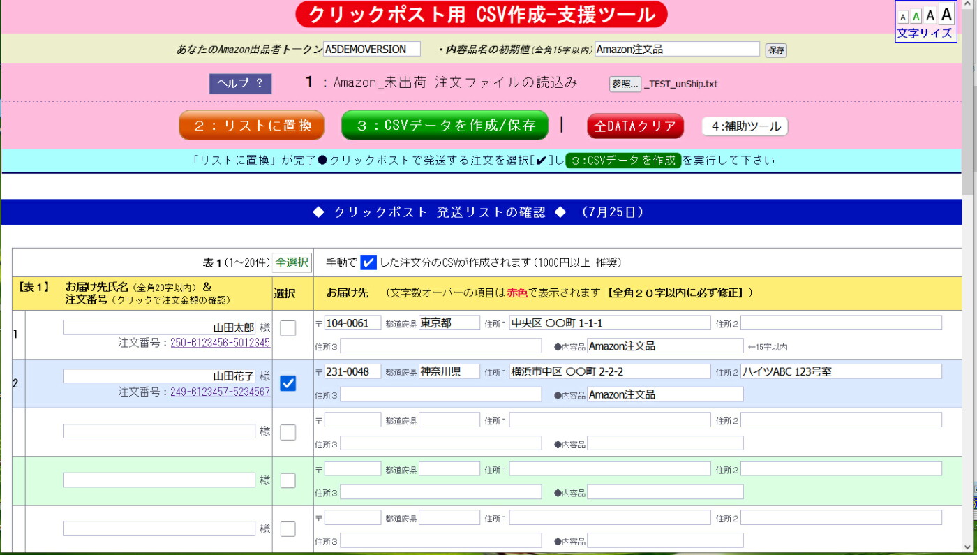 アマゾン未出荷注文レポートから読込んだファイルからクリックポストで発送する注文を選択できます。 - 文字数オーバーも検知